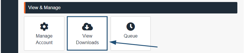 La descarga se puede iniciar desde la sección Downloads, disponible tanto en los accesos directos del Dashboard bajo la sección View & Manage, como desde la barra lateral izquierda de JetBackup.